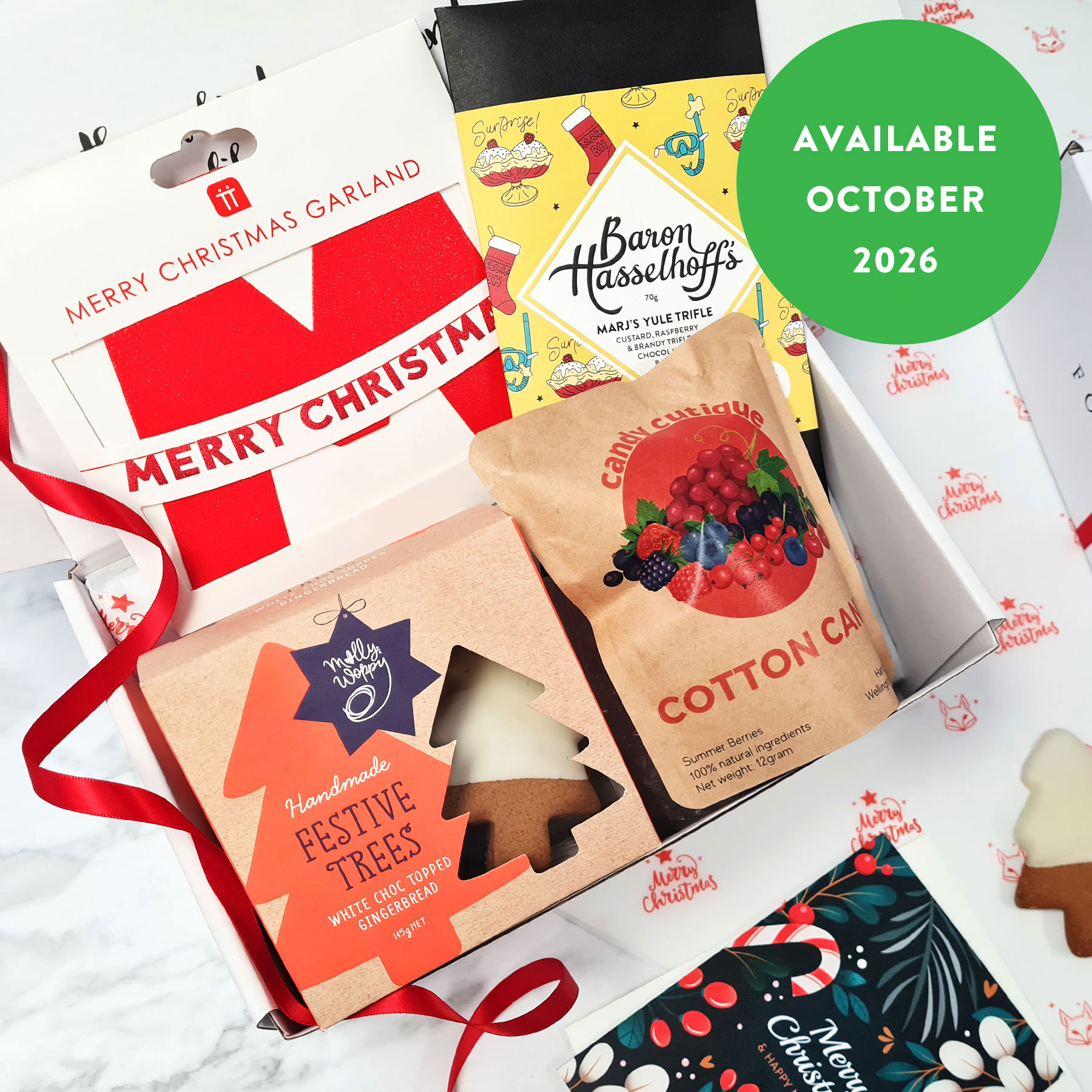 Introducing our Deck The Halls Christmas gift box—a festive treat that brings joy in every bite and sparkle to every space. Inside, they’ll find delicious gingerbread dipped in white chocolate, yummy summer berry cotton candy, the perfect Christmas chocolate (trifle chocolate – a custard, raspberry and brandy chocolate bar), and a glittering “Merry Christmas” garland to hang and make their house Christmas ready.