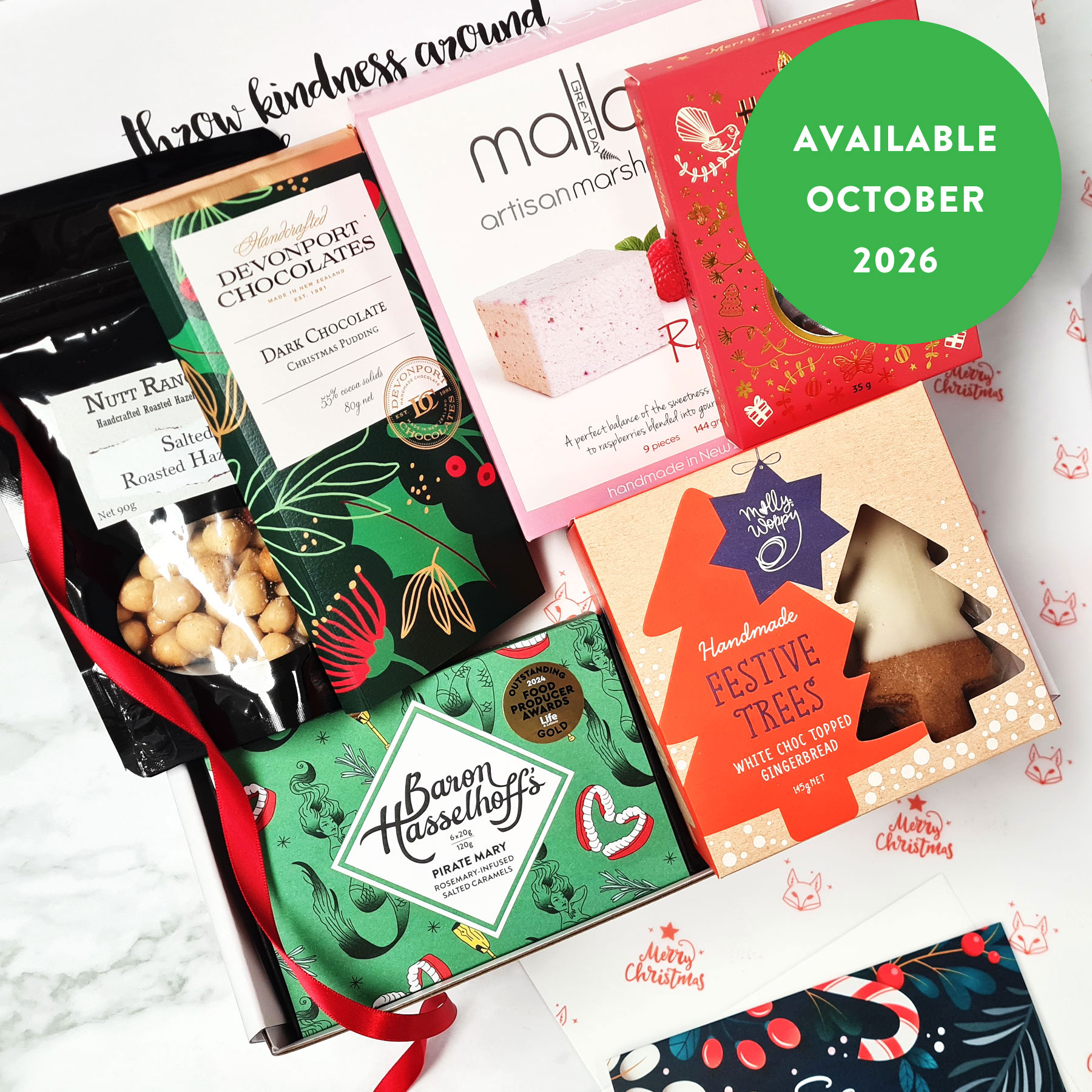 Inside this gift box of goodness they’ll find yummy gingerbread cookies dipped in white chocolate, craft Christmas chocolates and multi-award winning gourmet salted caramels, the finest artisan real fruit raspberry marshmallows and the freshest roast hazelnuts.