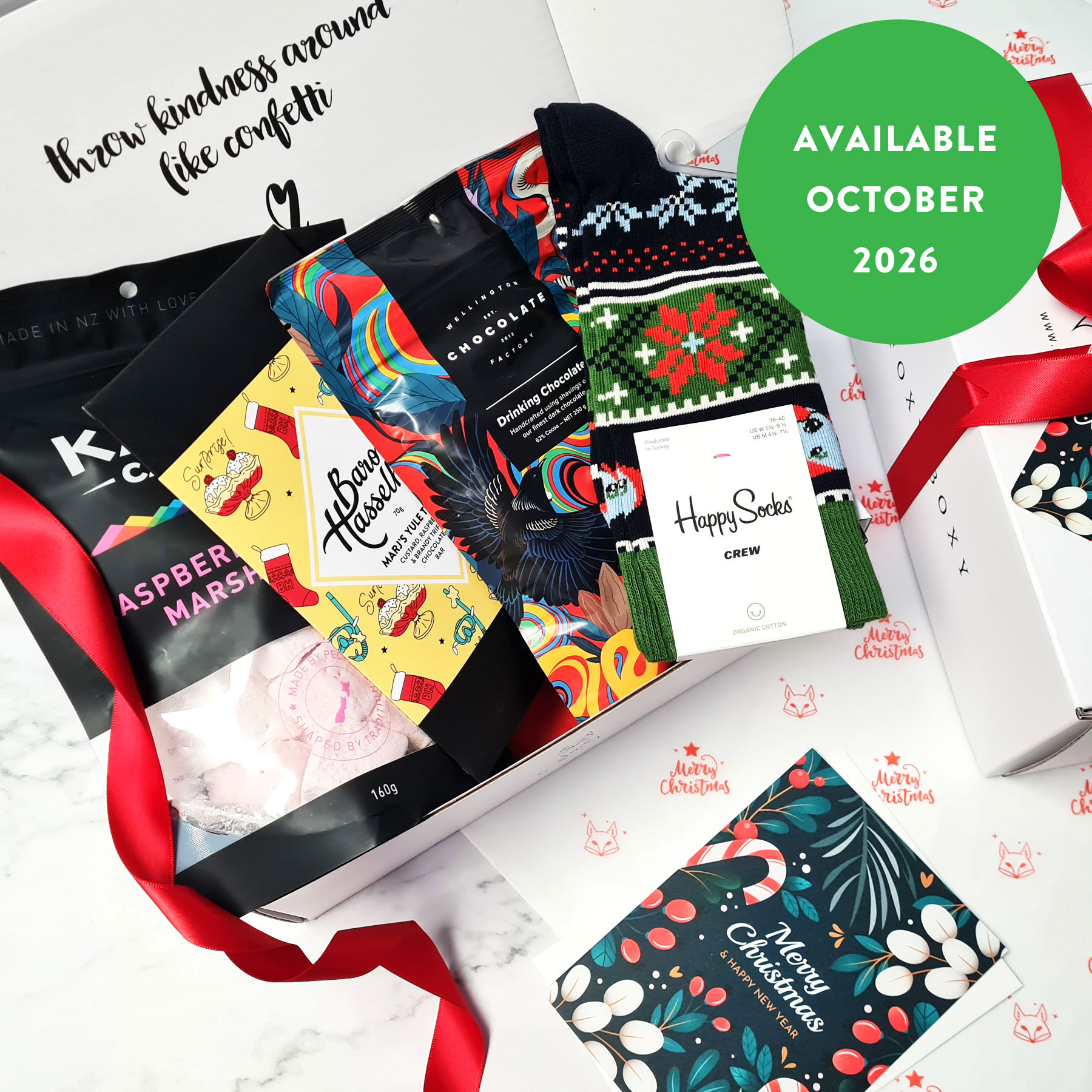 Wrap up the magic of Christmas from head to toe! Featuring the star of the season — the ugly sweater Christmas socks made from soft organic cotton. These socks are guaranteed to bring a smile to even the Grinchiest of people. Paired with festive NZ-made treats including Marj’s Yule Trifle Chocolate, creamy hot chocolate, and fluffy marshmallows — it’s one joyful gift box! 🎄🧦✨