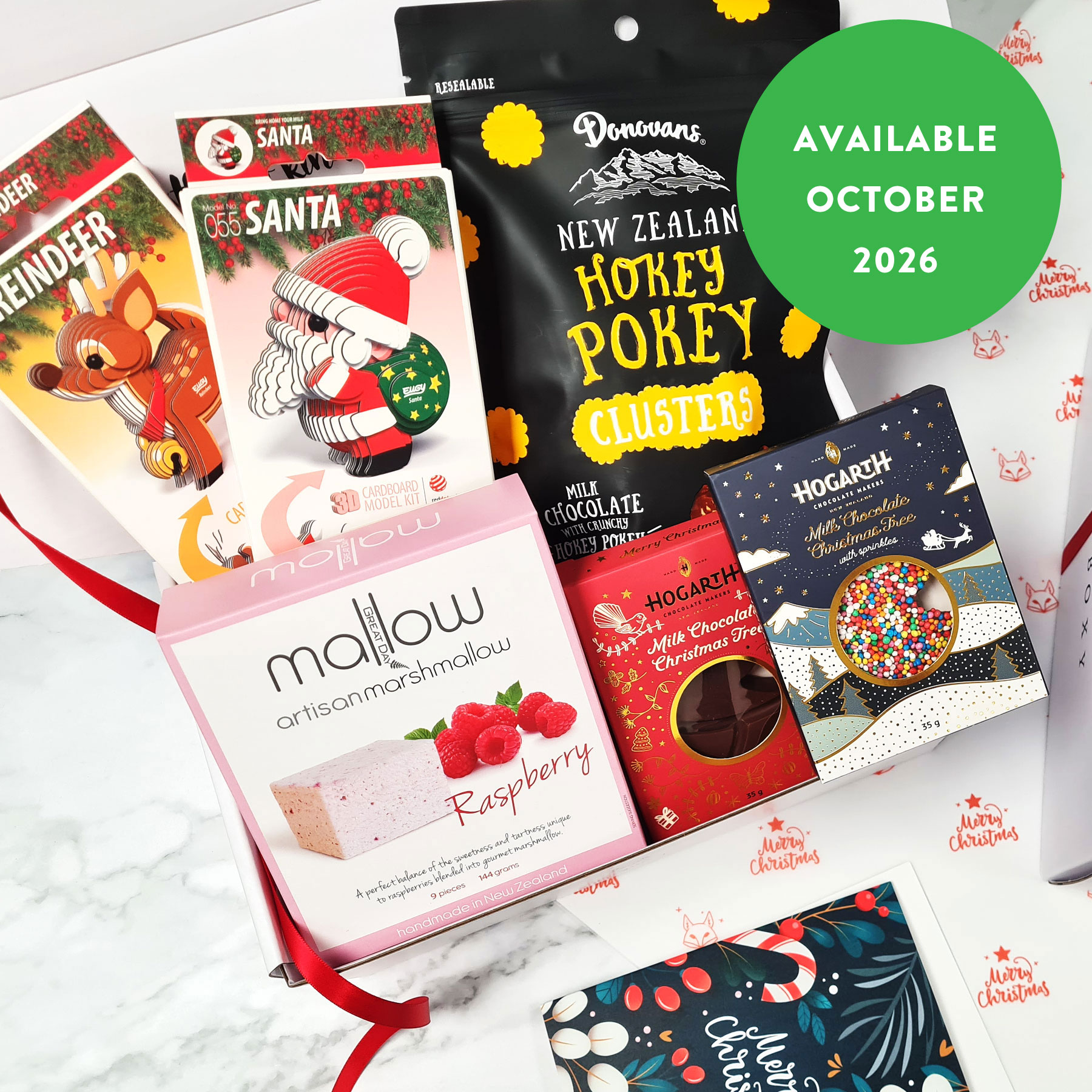 Then there’s the treats! The most yummiest raspberry marshmallows, delicious milk chocolate hokey pokey clusters and two chocolate Christmas trees. Enjoy under the lights of the Christmas tree or perhaps outside around the brazier toasting the marshmallows or while snuggled up on the couch watching their favourite Christmas movie.