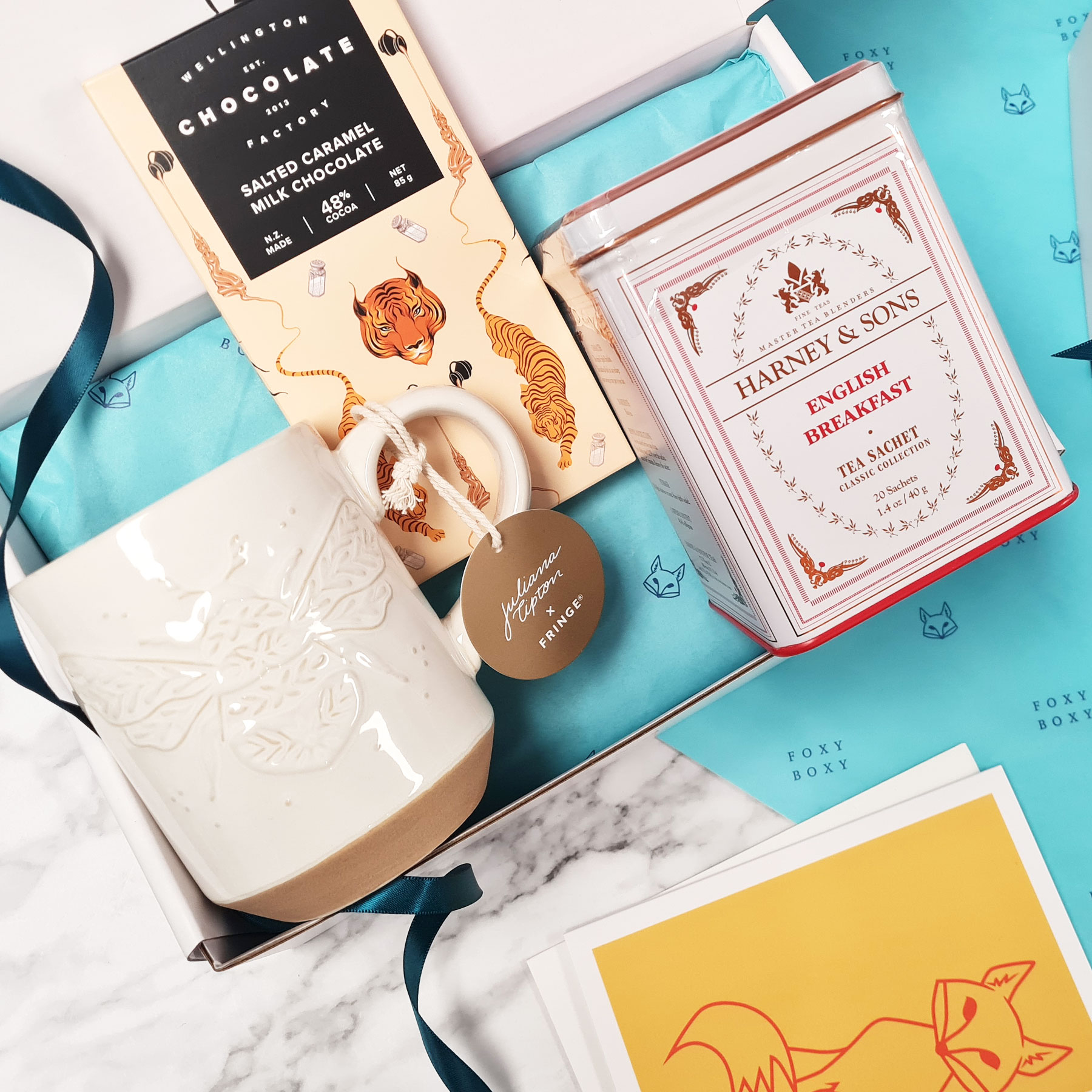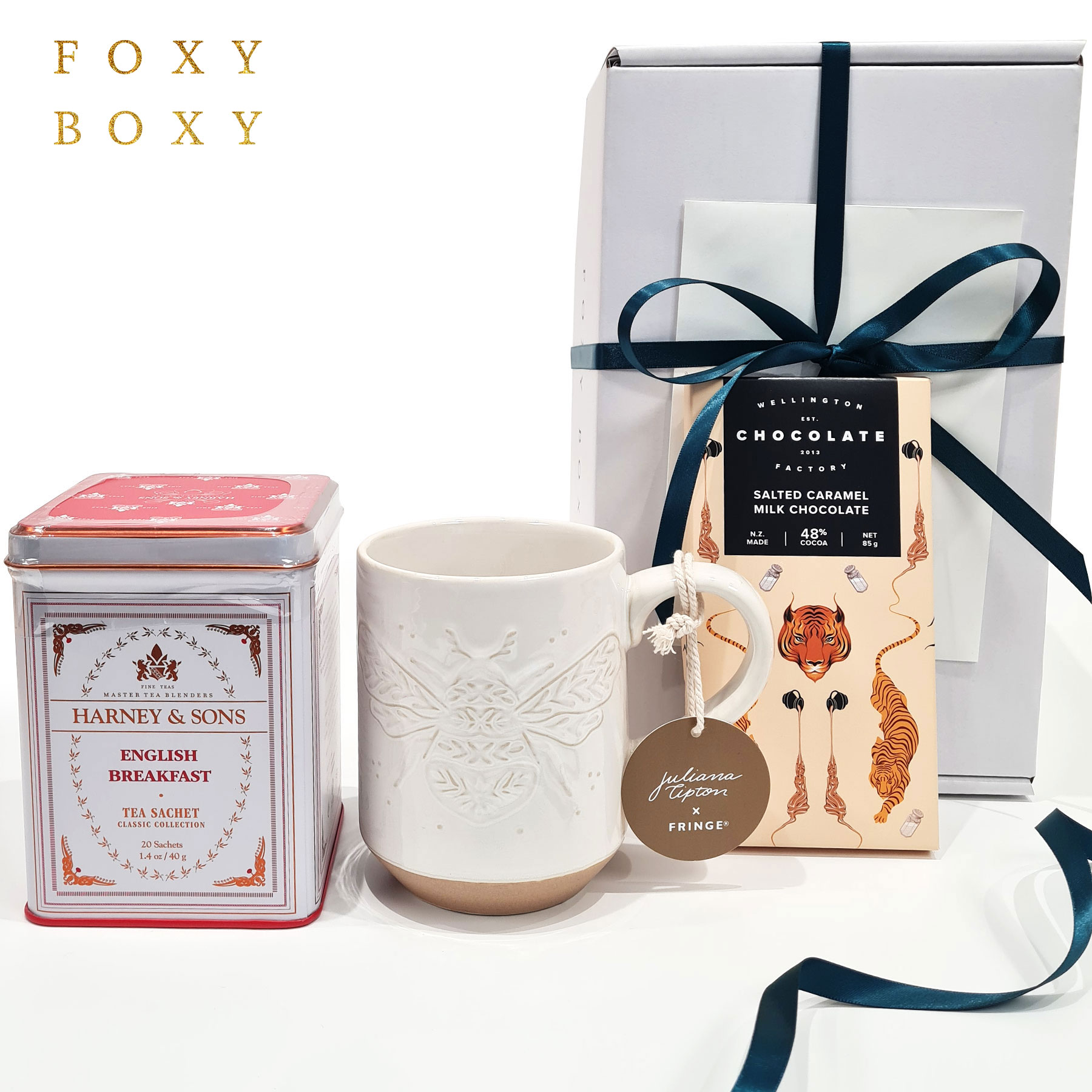 A gorgeous tin of the finest tea, their new favourite stoneware mug with raised bumble bee art, and finally an utterly delicious bar of New Zealand, award-winning, salted caramel milk chocolate.